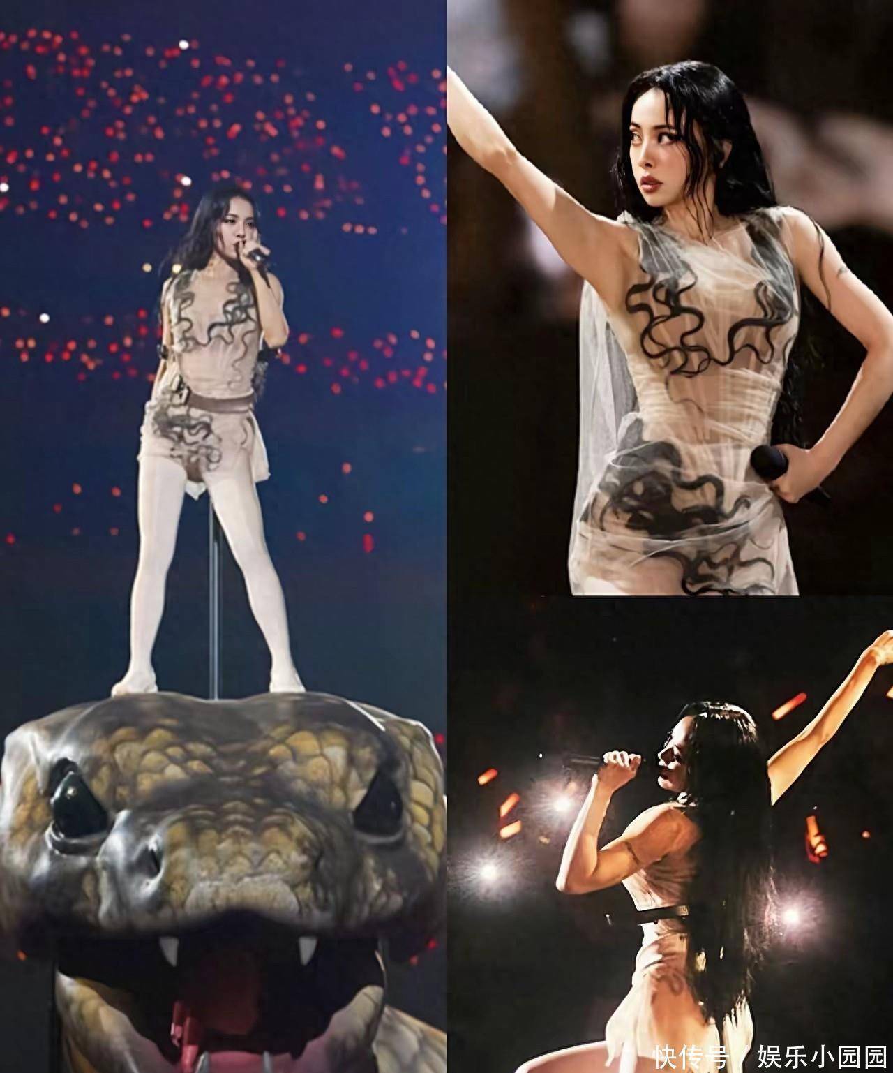 最绝的是蔡依林本东说念主的情景,真是太顶了。其时她身穿暗黑战袍,头戴百万级的4D蛇发头饰,就这样稳稳地站在蛇首之上,莫得任何安全驻守次第。在长达六分半钟的扮演里,她一边跟着巨蛇绕场巡游,一边全开麦演唱高难度的《好意思杜莎》。全程唱跳零额外,高音澄清穿透,气味稳得不行。45岁的年龄,这体能、这唱功,说是“华语乐坛劳模”少量皆不为过,几乎是把躯壳当兵器,把舞台当战壕在拼。