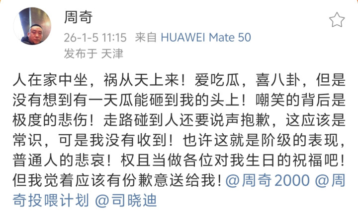 周奇称,但愿事情的“源泉”(激发此事的司晓迪——编者注)向他说念歉,正在洽商是否走法律阶梯,“(我)不应该跪着承受这种事情。”