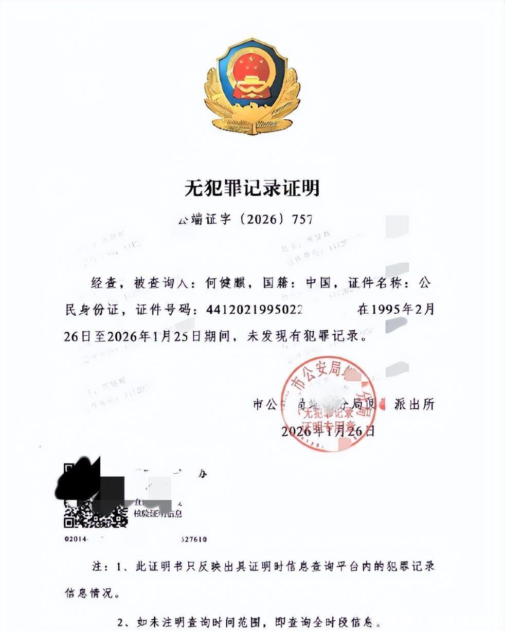在1月27日,何健麒的使命室,就晒出他在1995年2月26日至2026年1月25日历间无作歹记载,解说由公安机对于2026年1月26日开具,并注明隐敝“全时段信息”。