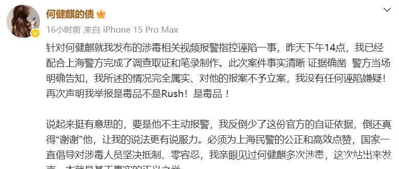 咫尺公论抓续在网上发酵,有的网友确信何健麒,毕竟他敢去发检和尿检,连无作歹记载皆开出来了。有的则无间确信何健麒的前女友,因为她在实名举报之后,已经合作上海警方完成了访问取证和笔录制作,看姿首是动真格的,并不像是诬蔑。