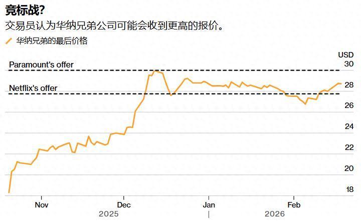 智通财经APP获悉开云体育(中国)官方网站,来回员们猜度华纳昆玉探索频谈(WBD.US)铁心权争夺战将促使其中一家竞购者提升报价。这家历史悠久的好莱坞制片厂的股价周三收于每股略低于29好意思元,此前一天,派拉蒙天舞(PSKY.US)暗示可能将报价至少提升1好意思元至每股31好意思元,股价一度片时窒碍该水平。华纳昆玉于旧年12月首肯以每股27.75好意思元的价钱出售给奈飞(NFLX.US),外加其旗下部分有线电视收罗(如TNT和CNN)的股份。